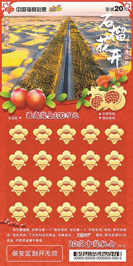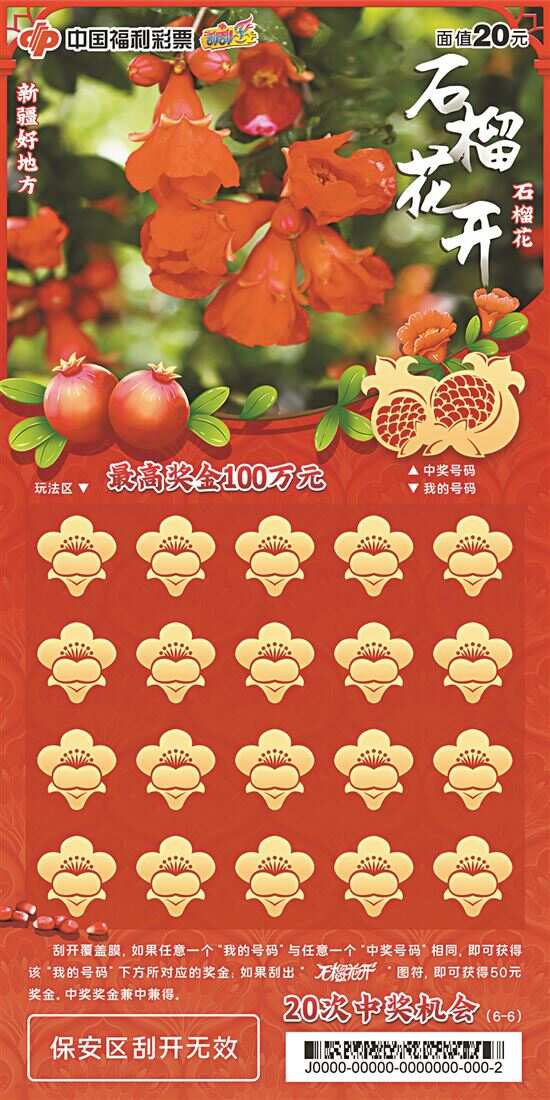 该款刮刮乐游戏面值20元,一套6张,票面中央以石榴枝为纽带,依次串联起石榴果、石榴籽、石榴花,各民族同心协力、团结奋进的面貌呼之欲出。同时,玩法区以石榴花元素作为图符,呼应票面主题,象征着民族团结之花生生不息。票面整体色调以红色为主,既是石榴花开的颜色,更是绚丽“中国红”。