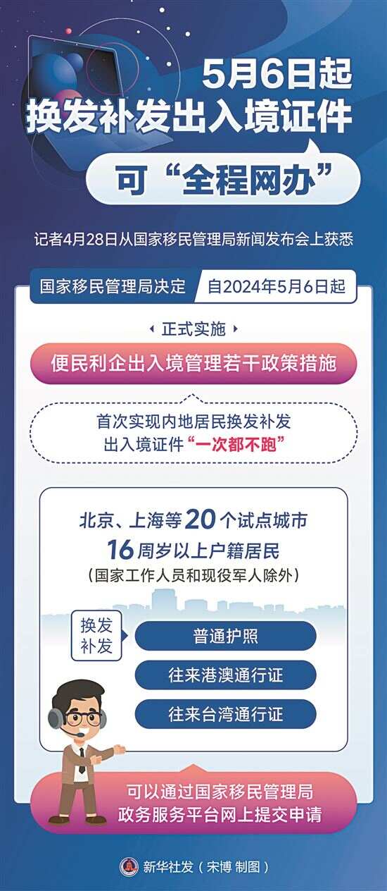据新华社电 记者28日从国家移民管理局新闻发布会上获悉,为服务促进高水平对外开放,进一步便利内地人员出入境,国家移民管理局决定自2024年5月6日起正式实施便民利企出入境管理若干政策措施,首次实现内地居民换发补发出入境证件“一次都不跑”。