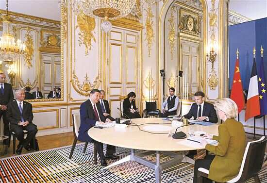 ■当地时间5月6日上午,国家主席习近平应邀在巴黎爱丽舍宫同法国总统马克龙、欧盟委员会主席冯德莱恩举行中法欧领导人三方会晤。新华社发