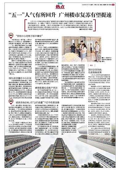 “五一假期广州整体去化率约14.1%,在目前的大环境下,广州各区域成交冷热分化明显,分化态势从区域扩大到项目,部分缺乏规划利好、存货较多,且优惠措施不明显的项目,获取客户的难度依然较大,例如白云北部、增城没有地铁的板块,表现略显乏力,楼市基本以特价优惠带动客户成交。白云区的几大项目均在白云西部或者北部,首日去化率不足10%。番禺、荔湾顺销项目加推也表现一般。”