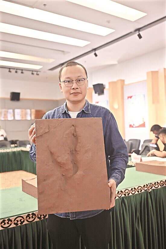 ■5月6日,中国地质大学(北京)副教授邢立达展示高精度恐爪龙足迹复原模型。 新华社发