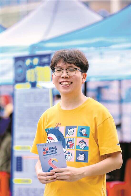■招聘会现场,苏志鹏作为公司准员工,游刃有余地向来往同学们提供招聘咨询服务。