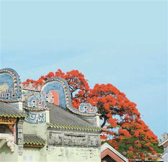 ■近日,广州白云区龙归镇周氏大宗祠的一棵凤凰花盛开,火红的花朵如满天红霞般挂满枝头,在岭南建筑群中尤为抢眼。 新快报记者 郭思杰/摄影报道