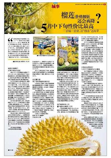 相比3月,5月的榴莲价格腰斩了?5月13日、14日,记者先后走访广州各大榴莲售卖点,发现榴莲的确稍有降价了,但并未出现“骨折价”或者“腰斩”的情况,特别是优质好果,降价幅度很低。