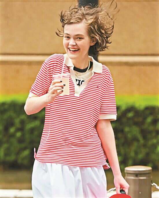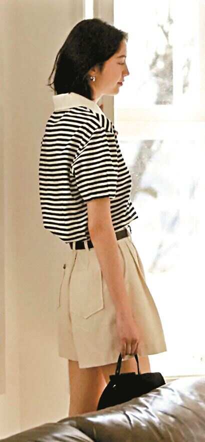 ■双色条纹Polo衫与海魂衫异曲同工,搭短裤轻松营造法式穿搭的松弛感。