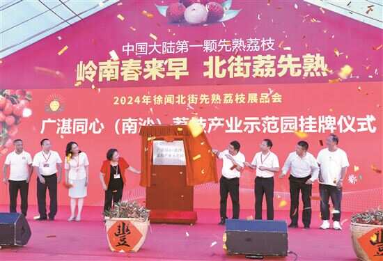 当天,2024徐闻县北街先熟荔枝展品会在这里举行。活动发布了徐闻荔枝营销首发仪式,表彰了2024年度徐闻“十佳荔枝种植能手”,并分别举行了广湛同心(南沙)荔枝产业示范园挂牌、北街荔枝文化广场打卡点揭牌仪式。新快报记者了解到,这次活动是广州市南沙区驻迈陈镇帮扶工作队在广州对口协作湛江指挥部、徐闻县委县政府等指导下,加快“徐闻先熟荔枝”品牌孵化,着力打造“中国大陆第一颗荔枝”公共品牌,助力迈陈荔枝产业高质量发展的重要举措。