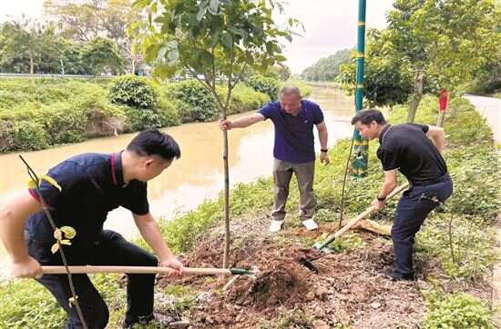 当天,一棵棵嫩绿的紫风铃树苗在帮扶双方干部群众努力下顺利栽种,为林头镇共青河岸边增添了一抹生机勃勃的绿色。新快报记者了解到,电白区为充分发挥驻村第一书记在乡村绿化工作中的党员先锋模范作用,不断提高驻村帮扶工作成效,开展2024年度“第一书记项目”领办活动,坚持把“第一书记项目”与乡村绿化工作结合起来。结合工作实际,驻槟榔村第一书记邹五军积极对接后方单位珠海市财政国库支付中心,募集资金2万元助力林头镇槟榔村绿美建设。