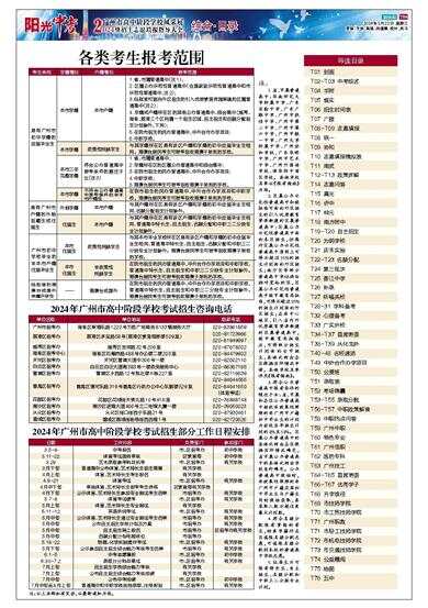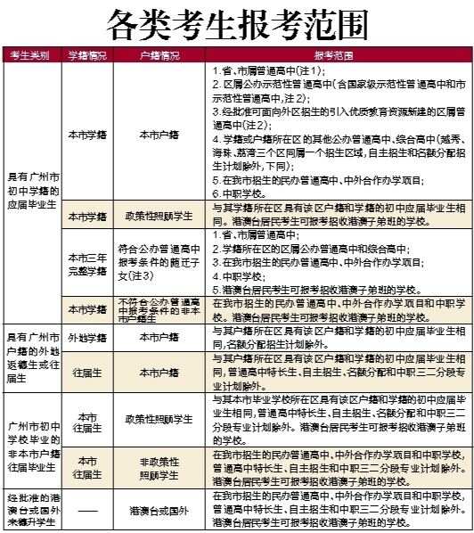 1.省、市属普通高中:华南师范大学附属中学、广东实验中学、广东广雅中学、广州市执信中学、广州市第二中学、广州市第六中学、广州市铁一中学、广州大学附属中学、广州协和学校、广东华侨中学、广州市艺术中学、广州外国语学校、清华附中湾区学校。具体学校名单以《报考指南》为准。