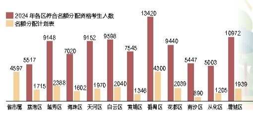 整体来看,虽然符合名额分配资格的考生今年增加了4642人,但名额分配竞争情况基本与去年持平,约为3.5名考生竞争一个名额,而去年为3.6名考生竞争一个名额。从各区数据可以看到,番禺区符合名额分配资格的考生人数最多,为13420人;其次为增城区,为10972人。从化区符合名额分配资格的考生人数最少,为5003人。