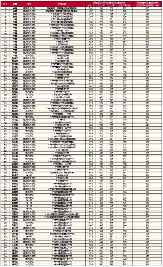2.华南师范大学附属中学(石牌校区)、华南师范大学附属中学(知识城校区)采用原华南师范大学附属中学录取最低分数;广东实验中学(荔湾校区)、广东实验中学(白云校区)采用原广东实验中学录取最低分数;广州市执信中学(天河校区)2021年采用广州市执信中学(执信路校区)录取最低分数;广州市第六中学(海珠校区)、广州市第六中学(从化校区)采用原广州市第六中学录取最低分数;广州市铁一中学(白云校区)2021年采用广州市铁一中学(越秀校区)和广州市铁一中学(番禺校区)录取最低分数平均值;广州市第五中学(金碧校区)2021年采用原广州市第九十七中学(金碧校区)录取最低分数;广州市南武中学(岭南画派纪念校区)2021年采用原广州市岭南画派纪念中学录取最低分数;广州市培英中学(白云新城校区)、广州市培英中学(鹤洞校区)2021年、2022年采用原广州市培英中学录取最低分数;广州市第六十五中学(江高校区)、广州市第六十五中学(同德校区)2021年、2022年采用原广州市第六十五中学录取最低分数;广州市花都区邝维煜纪念中学(雅正校区)2021年采用广州市花都区邝维煜纪念中学(校本部)录取最低分数。