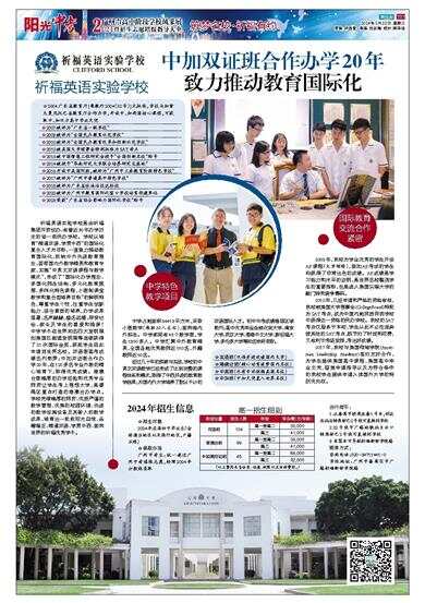 祈福英语实验学校是由祈福集团斥资创办、有着近30年办学历史的省一级民办学校。学校以培育“精通双语、学贯中西”的国际化复合人才为目标,一直致力推动教育国际化,吸纳中外先进教育理念,荟萃国内外教学精英和教育专家,实施“中英文双语课程与教学模式”,形成了“国际化办学理念、多国化师生结构、多元化教育氛围、多样化特色课程、小班制课堂教学和复合型培养目标”的鲜明特色,尊重学生个性,注重学生创新能力、综合素质的培养,办学成果显著,名声赫赫,盛名远播,深受社会、家长及学生的喜爱和推崇!中学学子在世界知名四大发明展如美国匹兹堡发明展等连续获得了21次国际金奖,获奖学生因此申请到世界名校。双语班高考成绩名列前茅;中加双证班合作办学20年,在120多名专业外教的精心培育下,取得优秀成绩。港澳台班雄厚的办学经验和优秀专业师资让学生考上理想大学,是番禺区重点打造的港澳台办学点。学校凭借雄厚的师资、优质严谨的教学管理、优美的校园环境、先进的教学设施设备及其骄人的教学成果,培育出一批批阳光自信、品德端正、精通双语、学贯中西、面向世界的祈福优秀学子。
