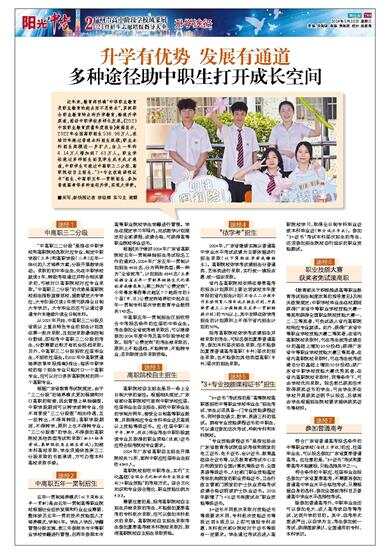 近年来,教育部明确“中等职业教育是职业教育的起点而不是终点”,紧抓符合职业教育特点的升学教育,畅通升学渠道,推动中职学校多样化发展。《2023中国职业教育质量年度报告》数据显示,2022年全国高职招生538.98万人,连续四年超过普通本科招生规模;职业本科招生规模进一步扩大,由上一年的4.14万人增加到7.63万人。职业学校通过多样招生拓宽学生成长成才通道,中职学生可通过中高职三二分段、高职院校自主招生、“3+专业技能课程证书”招生、中高职五年一贯制招生、参加普通高考等多种途径升学,实现大学梦。