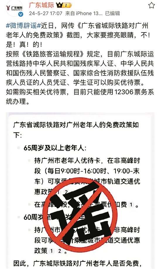 新快报讯 记者李佳文 王彤报道 “不!是!真!的!”昨日,广东城际官方微博发布了一条辟谣消息,针对近日网上热传的有关“广东省城际铁路对广州老年人的免费政策”的截图,广东城际给了一个巨大的“谣”字戳。