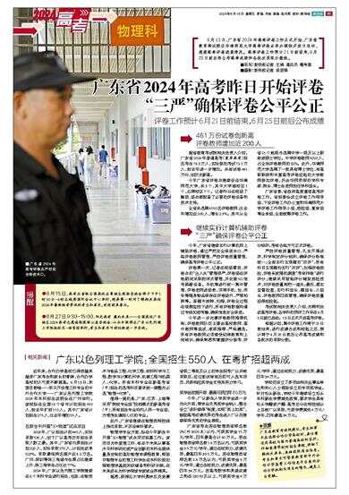 6月13日,广东省2024年高考评卷工作正式开始,广东省教育考试院在华南师范大学高考评卷点举办媒体开放日活动,通报高考评卷进展情况。高考评卷工作预计21日前结束,6月25日前后将公布高考成绩和各批次录取分数线。