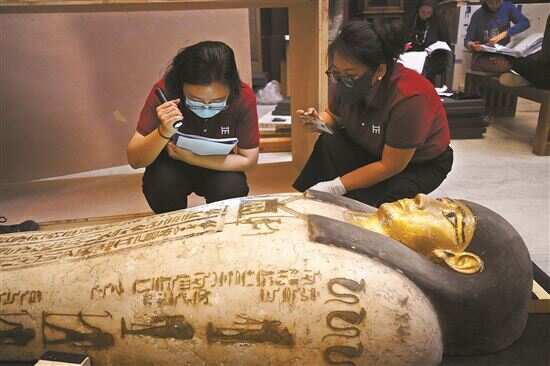 ▲5月23日,在位于埃及首都开罗的埃及国家博物馆,上海博物馆的工作人员对一件木乃伊棺盖进行检查。新华社发