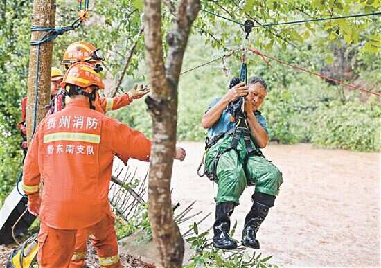 6月29日,在贵州省黔东南苗族侗族自治州施秉县城关镇伍旗村,消防员转移被困村民。