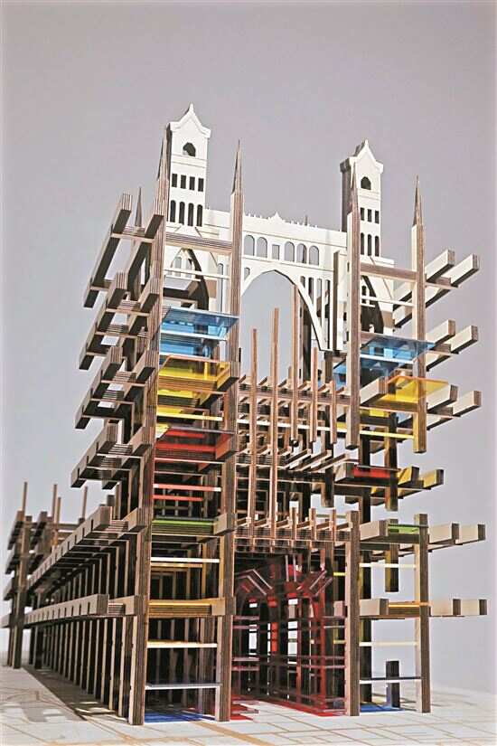 在展厅中,毕业生邓惠丹的《历史纬线》较为亮眼。作品选取了五座广州最具代表性的建筑进行创作,通过木构建的形式重新诠释广州这五座传统的城市标志性建筑,赋予了它们新的形象。为体现地方文化的独特性,每座建筑都与岭南特有的满洲窗元素相结合;部分建筑模型展示了一种“消减效果”,通过建筑形状的部分消减,营造出一种透视与空间的深度感,引导观众进行更深层次的视觉探索。这种效果不仅展示了建筑的不同视角和维度,也象征着城市变迁中新旧更替的过程。