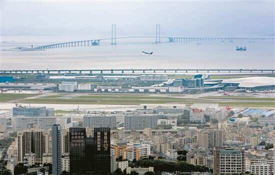 ■6月30日下午3时,深中通道通车试运营,截至7月1日下午3时,深中通道通车24小时车流量达到12.5万辆次,维持高位运行。图为深圳宝安机场与深中通道同框。 新快报见习记者 观显锋/摄