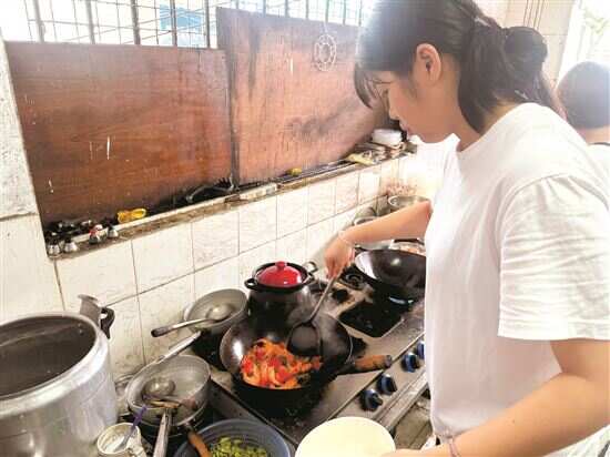 越近中午,前来做饭的客人越多,切菜声、炒菜声、锅碗瓢盆的碰撞声充斥在厨房的每个角落,与升腾的油烟混合在一起,形成独特的气氛。