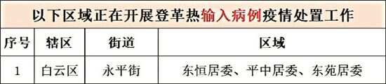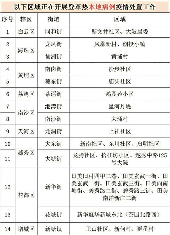 广州市疾控中心透露,5月以来广州市已陆续报告多例本地和输入登革热病例。截至7月18日,广州市白云区、海珠区、黄埔区、荔湾区、南沙区、天河区、越秀区、花都区、增城区内均有区域正在开展登革热疫情处置,存在传播风险。