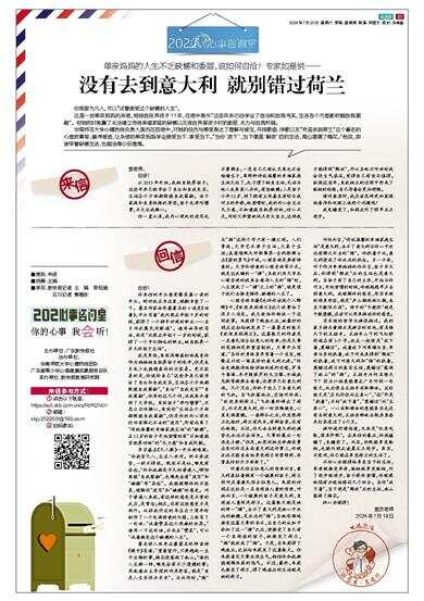 心理咨询书籍《也许你该找个人聊聊》中,《欢迎来到荷兰》这个故事给了很多人启发。我大致给你转述一下这则故事。朱莉得了绝症之后,她最好的朋友达拉给她发来了一篇著名的散文《欢迎来到荷兰》。这篇散文的作者是一名唐氏综合征患儿的母亲,但是文章的笔调却是举重若轻的。文章开头写道:“当你的身体里孕育着一个宝宝,就像在计划一场美妙的意大利之旅。”你会充满期待地做详细的旅行攻略,罗马斗兽场、米开朗琪罗的大卫像、水城威尼斯等都要去看看,还要学几句意大利语。几个月后,你终于坐上了去意大利的飞机。当飞机落地后,空姐对你说:“欢迎来到荷兰。”飞机最终停在了荷兰,而不是意大利,你一时很难接受,心里充满遗憾。一番挣扎之后,你发现荷兰也挺好,荷兰有风车,有郁金香,还有伦勃朗。不过,你无法去到意大利的痛苦也永远不会消失。文章的最后一句画龙点睛:“但是,如果你把生命都浪费在哀叹你没去成意大利这件事上,你就永远不能自由地享受荷兰非常特别、非常美好的方方面面了。”