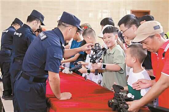 在警用设备装备展示环节,剑齿虎装甲防暴车、攀登突击车、猛士防弹车、防暴水炮车……如同名字一样霸气的特警车辆一字排开,吸引了小朋友和家长争先恐后合照留念。在特警的安全指导下,小朋友们纷纷上手体验专业特警装备,过了一把“特警瘾”。“平时只有在电影电视中看到这些枪,今天能近距离看到,真的太惊喜了。”第一次摸到真枪的同学,兴奋之情溢于言表。