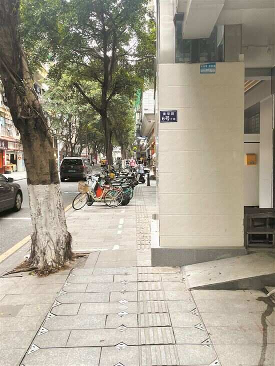 此前,黄华路六号之四的电梯占用盲道,且离行道树过近。
