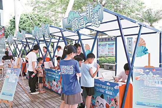 走进社区活动现场,精彩的文艺展演、多样的游戏互动和可爱的乐小星吉祥物吸引了众多群众纷纷围观、驻足参与。此外,现场特别设置了体彩即开票体验区、博物展览区、体育互动区,以及“篆刻非遗”“传统扎染”“糖画制作”非遗项目体验区等。