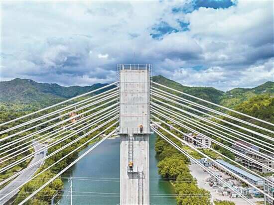 ■7月24日,宁波工务段防洪检查小组的铁路工人对杭温高铁楠溪江大桥主塔进行巡检(无人机照片)。新华社发