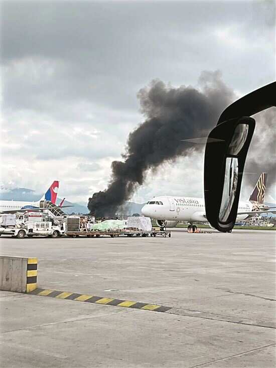 ■7月24日,在尼泊尔加德满都,一架客机在特里布万国际机场坠毁后冒出黑烟。新华社发