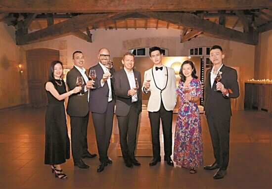 ■人头马CLUB品牌代言人李现(右三)与人头马君度集团中国区首席执行官Sophie Phe(右二)、人头马酒庄首席执行官让·菲利普·埃凯(左四)及品牌高层举杯共致人头马300年好事。