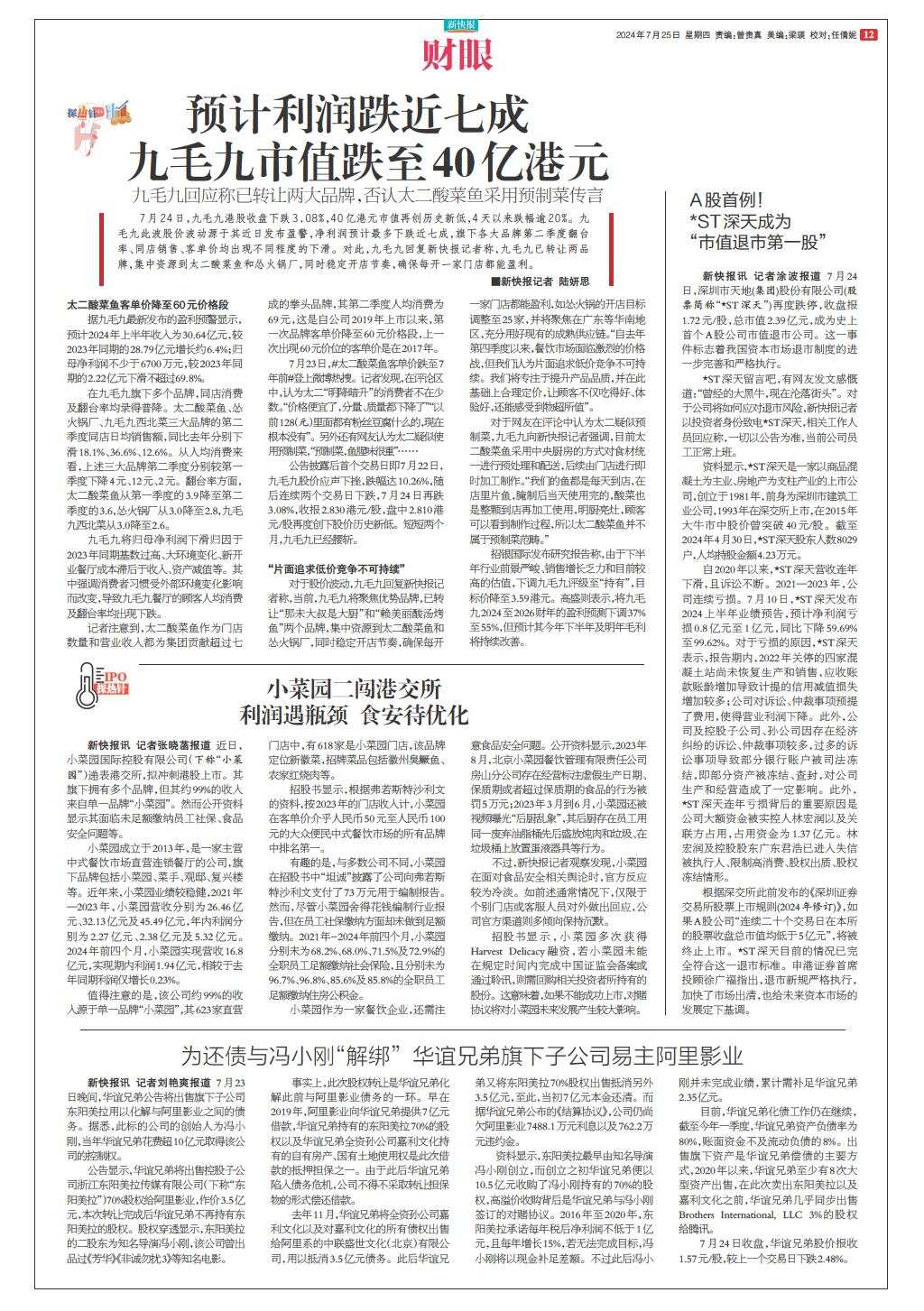 预计利润跌近七成 九毛九市值跌至40亿港元