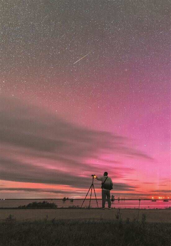 8月12日晚,在黑龙江省佳木斯市松花江富锦段拍摄的英仙座流星和极光。12日晚至13日晨,英仙座流星雨迎来极大,12日还发生了大地磁暴,因此流星雨幸运地遇上了极光。英仙座流星雨与象限仪座流星雨、双子座流星雨并称为北半球三大流星雨。新华社发