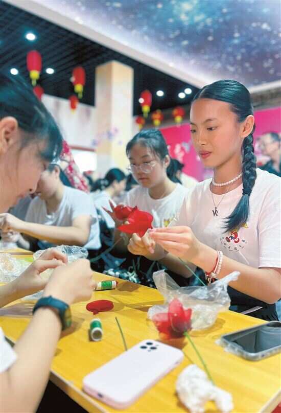 “这是木棉花,也是广州的市花,我们今天就来教大家如何用这些材料做成一朵漂亮的木棉花。”乞巧婆婆一边说,一边教孩子们制作,不一会儿,一朵朵娇艳欲滴的木棉乞巧供花就完成了。看着自己的作品,营员们成就感满满。“乞巧习俗以这种人们可欣赏、可品尝、可体验、可聆听、可互动的方式随时随地呈现,让传统民俗文化被看到、被了解、被喜爱、被传播,因此我们特意将夏令营其中一天安排在七夕节体验乞巧文化,希望他们通过亲身的体验和感受,对中国传统文化有更深刻的理解和印象。”工作人员笑着说。