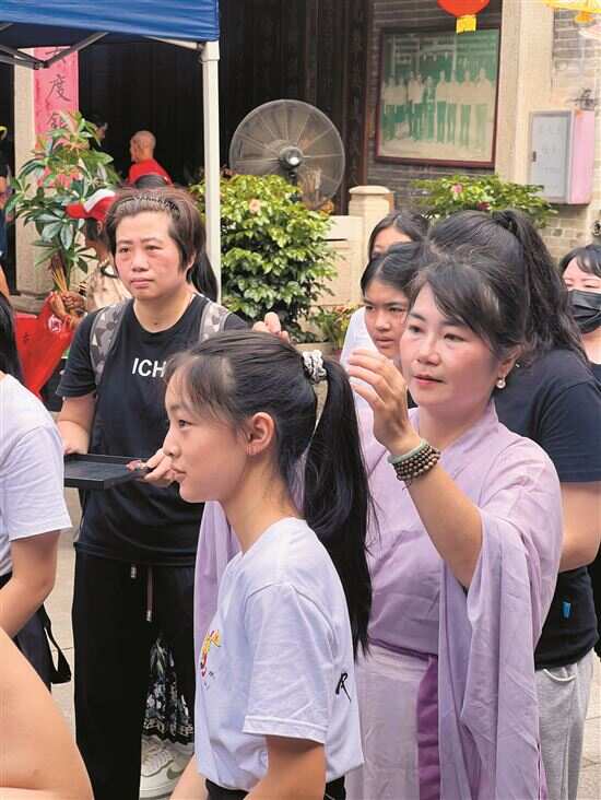 8月10日,正值“七夕节”,营员们也迎来了“民俗日”的重头戏——体验乞巧成人礼。9时30分,在广州天河珠村,处处张灯结彩,明德堂案上摆满了各式各样的乞巧作品,24名适龄女营员列好队伍,聆听乞巧婆婆讲述乞巧民俗和成人礼的注意事项。“乞巧文化起源于先秦,形成于汉代,是中华民族文化中一颗璀璨的明珠。”乞巧文化非遗传承人介绍道,“七夕节(天河乞巧习俗)”是国家级非物质文化遗产项目,也是天河区民俗的“金字招牌”。