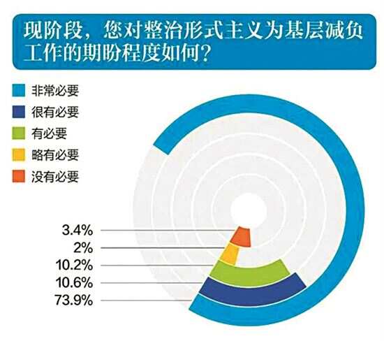 基层有呼声,中央有回应。基层干部的所思所想、所需所盼,是党中央高度关注的工作重点。从问卷情况看,在回答“对整治形式主义为基层减负工作的期盼程度如何”这一问题时,有94.7%的受访者选择了“必要”至“非常必要”的选项,其中,选择“非常必要”的占73.9%。这充分印证了党中央对于基层干部减负需求的把握是科学精准的,对于把基层干部从形式主义束缚中解放出来的关怀是实实在在的。