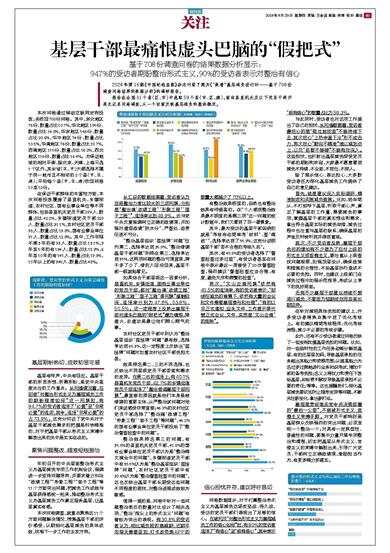 2024年第16期《中国纪检监察》杂志刊载了题为《“数看”基层减负进行时——基于708份调查问卷结果的数据分析》的调研报告。
