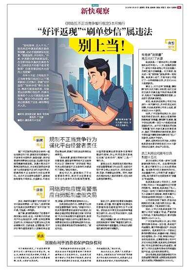 今年9月起,《网络反不正当竞争暂行规定》(以下简称新规)正式施行,明确“好评返现”“刷单炒信”等行为违法,商家可能面临罚款、吊销营业执照等行政处罚,而参与刷单的个人也可能面临法律风险。就这个热点话题,新快报记者请教了法官、律师等相关人员。