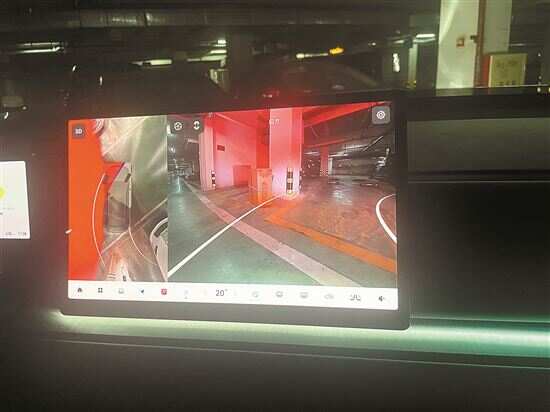张先生拍摄的故障画面,在车机上360全景观察模式,左侧变成了一片红色,无法使用。