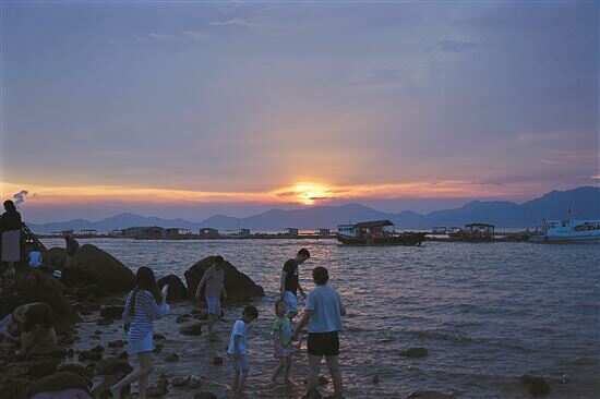 “骑上我心爱的小摩托,它永远不会堵车。”岛上有许多共享电动自行车,夕阳西下时,可以沿着环岛路骑行,前往西边的马尾岛看落日与赶海。马尾岛的旁边是一个渔港,可以看到“千帆归港”的温馨景象。进岛的路口有赶海的工具售卖,花十几元买一个小铲和水桶,就能享受到捞鱼蟹的趣味。