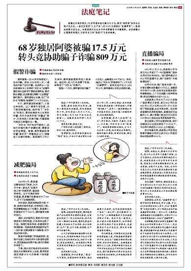 被骗后为挽回损失,68岁阿婆协助行骗809万元;购买“减肥药”食用后出现不良反应,一查还发现是“三无产品”;花9180元请团队“直播带货”,一瓶清洁液都没卖出去。本期案例关注生活中的消费骗局与诈骗陷阱。法官提醒公众增强防范意识,守护好自己的“钱袋子”与身体健康。