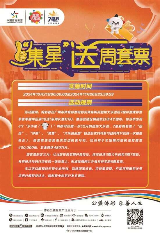 本次活动面向全广州市体育彩票电彩实体店开展,2024年10月21日至11月20日,凡购买超级大乐透或7星彩游戏彩票单张单期单倍满10注(须采用长票打印),票面营销区将随机打印4个图形,如当中出现4个“乐小星”则即可获赠一张12元的超级大乐透、7星彩周套票,此次活动共计随机派发赠票400,000张,总金额达480万元。