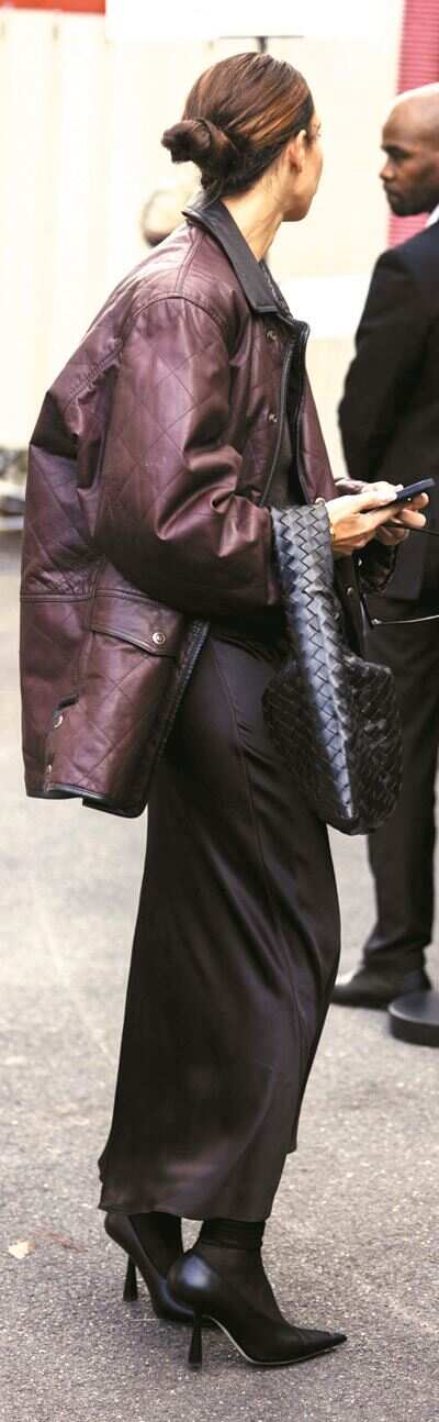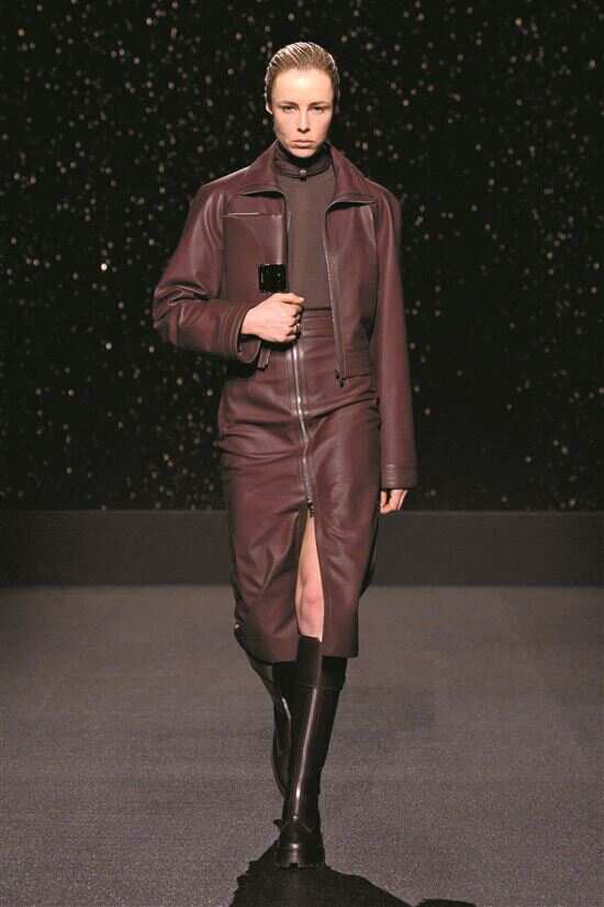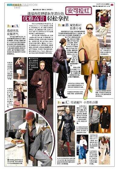 安可拉红虽源于红色系,但因有适量黑色或深色成分,整体色调偏暖,自带复古温暖的感觉,尤为适合秋冬季的造型穿搭,能很好与季节氛围相融合。不过与此同时也容易显沉闷老气,故此面料选择要以质感优先为原则,避开软塌黯淡的面料,首选有光泽、挺括的料子如皮质或缎面单品。