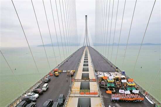 新快报讯 记者许力夫 毕志毅 通讯员粤交集宣 张鸣子 张勇辉报道 昨日上午,在摊铺机的轰鸣声中,黄茅海跨海通道项目保利长大T10标顺利完成黄茅海大桥右幅钢桥面沥青摊铺,标志着项目全线铺装工程全部圆满完成,海上长龙正式“由白转黑”。