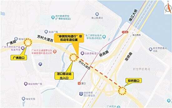 本次改造选址在芳村大道西(滘口客运站至双桥路段)东往西出城方向,结合路段机动车、非机动车流量分析及道路条件,通过减少一条机动车道,打造一条从滘口客运站直接衔接珠江大桥慢行通道出入口的“单侧双向通行”非机动车道。