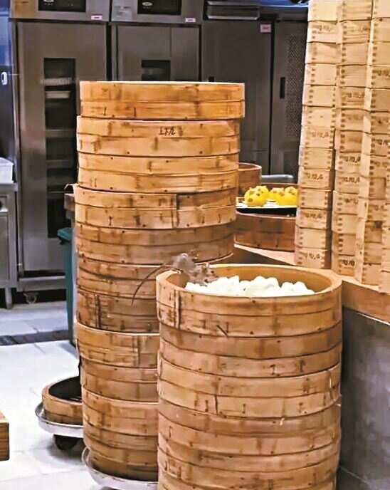 流传视频画面显示,一只老鼠在堆叠数层的点心蒸笼上“啃食叉烧包”,蒸笼上有“陶陶居”“上下九”的字样。拍摄视频的食客焦急地问:“怎么没有人过来看一下呢?”