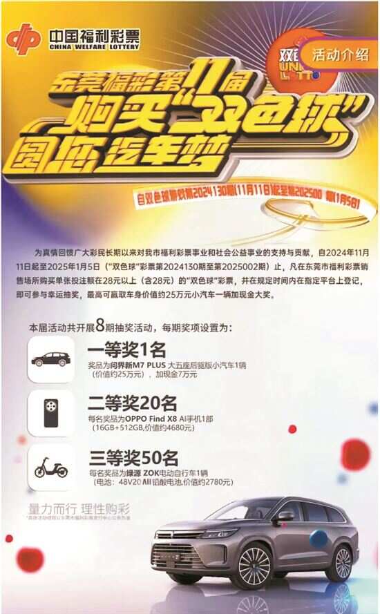 自2024年11月11日起至2025年1月5日(双色球彩票第2024130期至第2025002期)止,凡在东莞市福利彩票销售场所购买单张投注额在28元以上(含28元)的双色球彩票,并在规定时间内在“东莞福彩”微信小程序上登记,即可参与幸运抽奖,最高可赢取车身价值约25万元小汽车一辆加现金大奖。