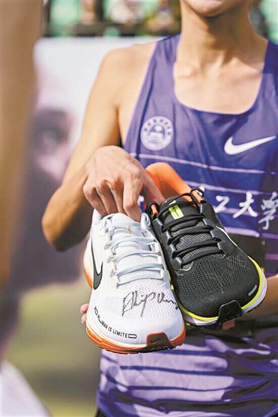 赛后,基普乔格与苏炳添为获得冠军的男女选手送上签名跑鞋,两人随即将各自左右脚的鞋子互换,组成了鸳鸯配色。拿着极为珍贵的签名版战靴,两名同学笑得十分灿烂。