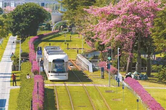 盛开的粉色木棉花在微风中摇曳生姿,在阳光下闪耀着柔和的光泽,与蓝天、小蛮腰、有轨电车交相辉映,美不胜收,吸引不少市民前来拍照打卡。