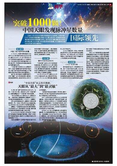 记者11月26日从中国科学院国家天文台获悉,“中国天眼”FAST发现脉冲星数量已突破1000颗,超过同一时期国际其他望远镜发现脉冲星数量的总和。其中包括大量的毫秒脉冲星和脉冲星双星,大大丰富了脉冲星的种类和数量,对于理解脉冲星的形成和演化具有重要意义。